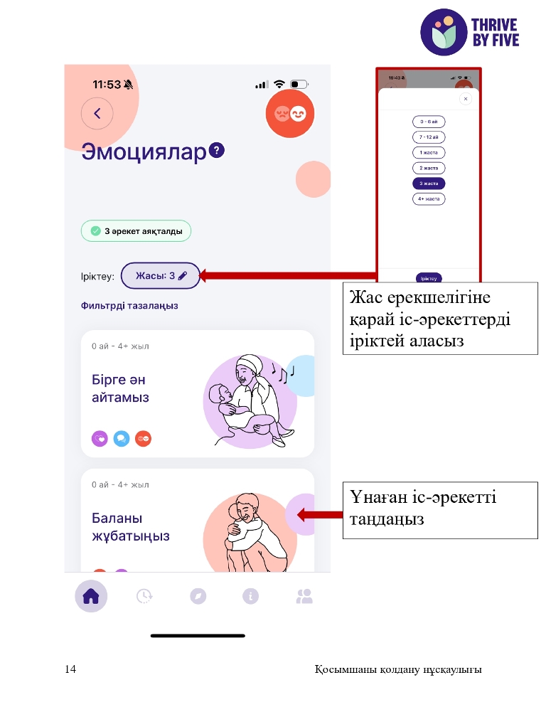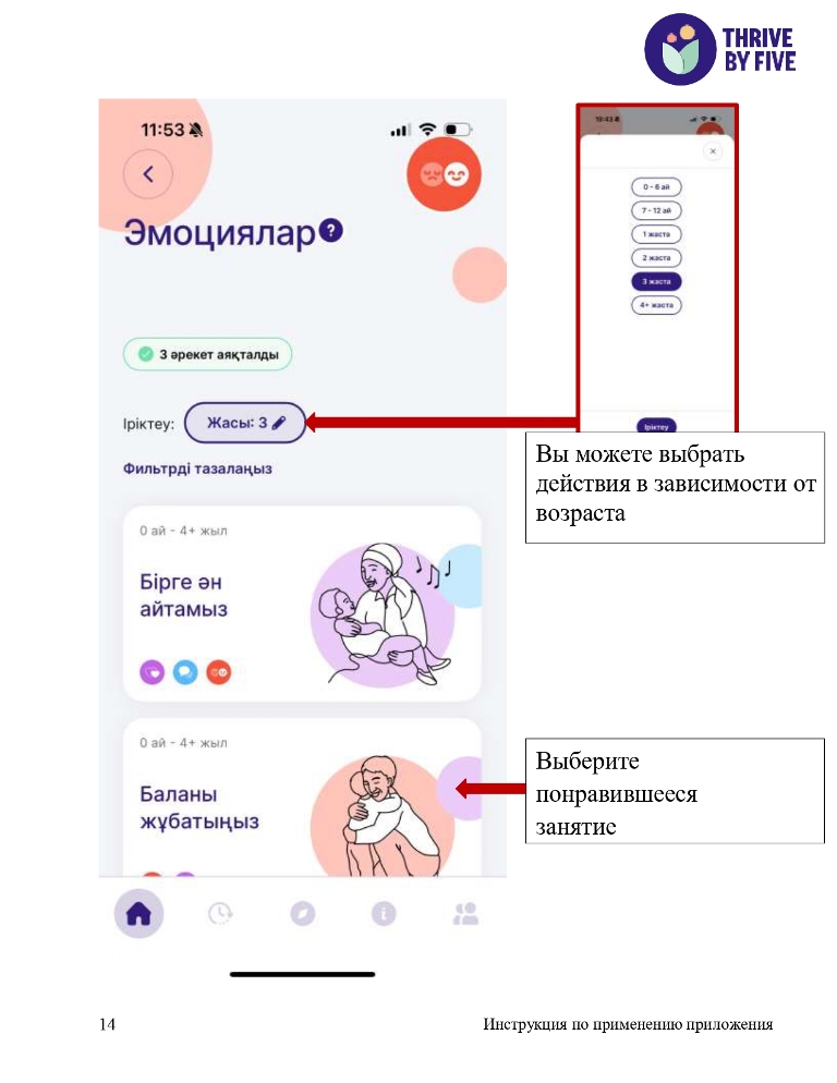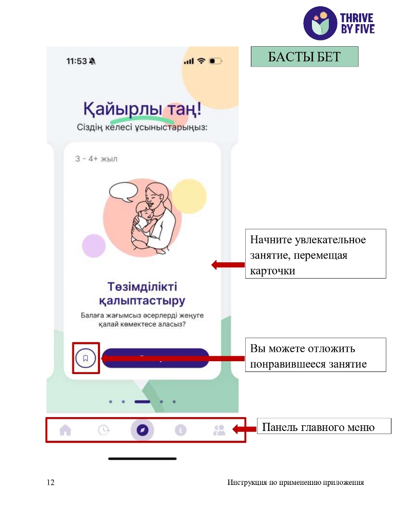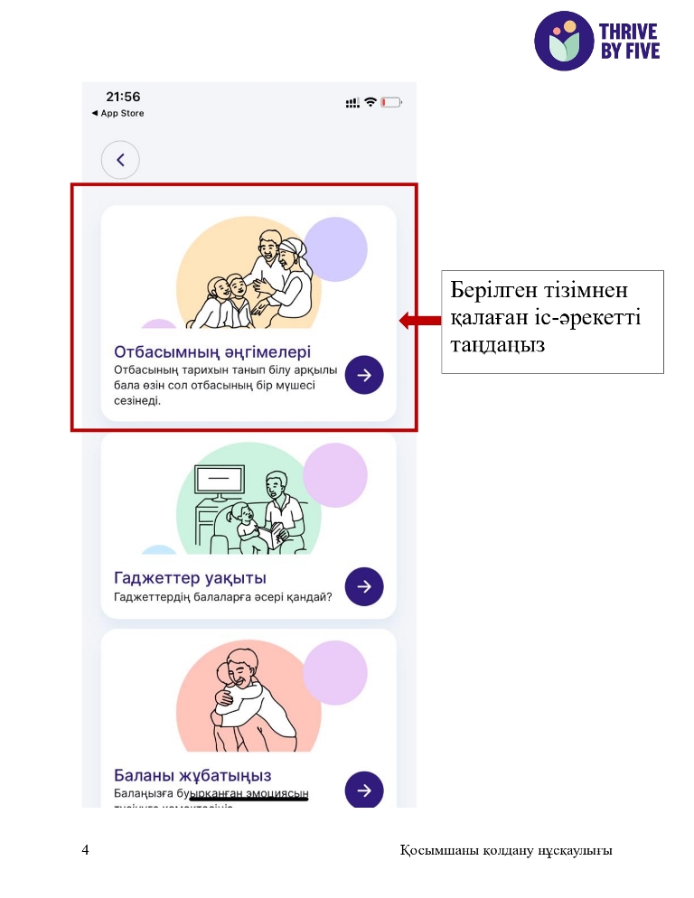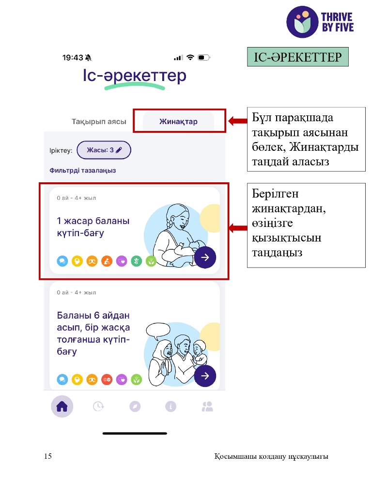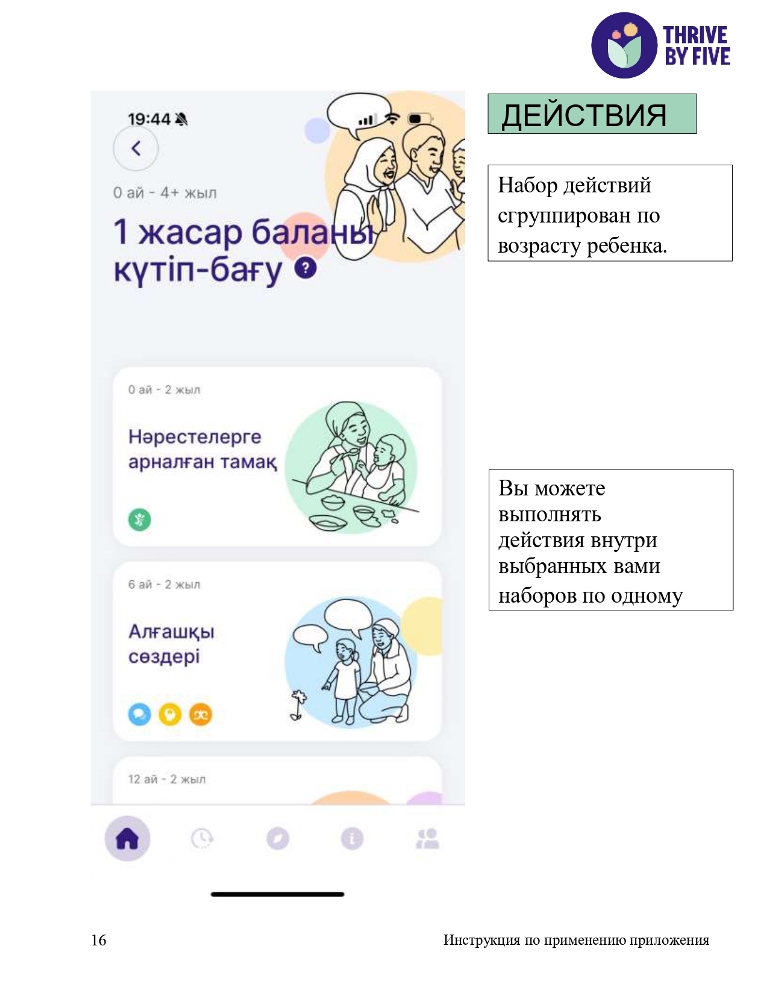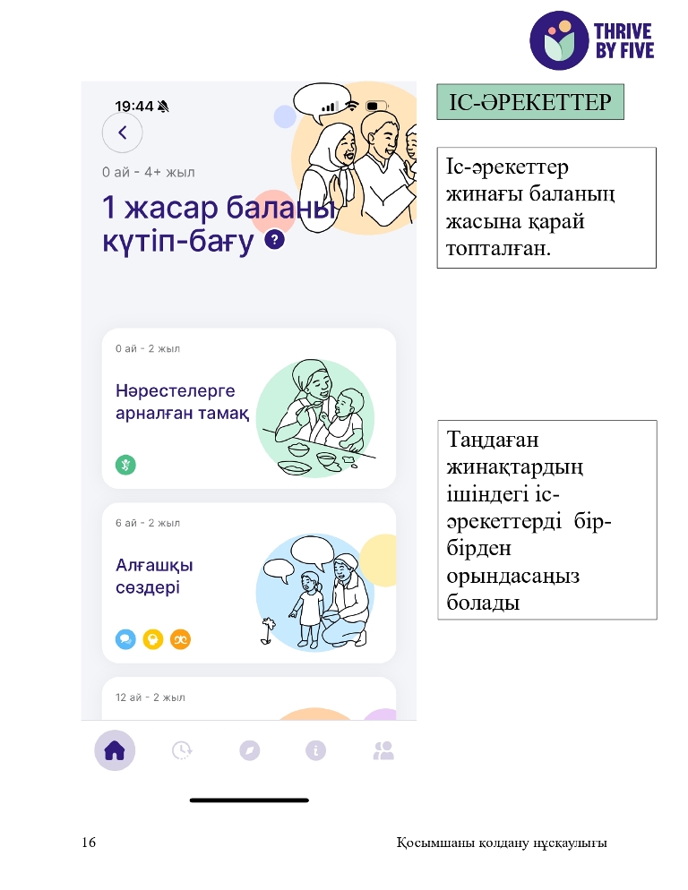 Мобильное приложение предоставляет для родителей, воспитывающих детей в домашних условиях, легкодоступные короткие практические активности по здоровью и питанию, воспитанию, развитию творческих и коммуникативных навыков, играм и взаимоотношениям. Контент предоставляет 120 идей для занятий с детьми по 10 направлениям на казахском, русском и английском языках.