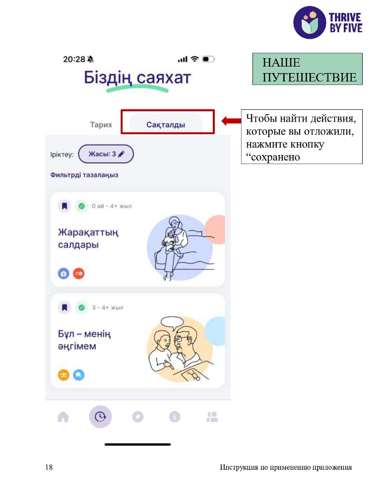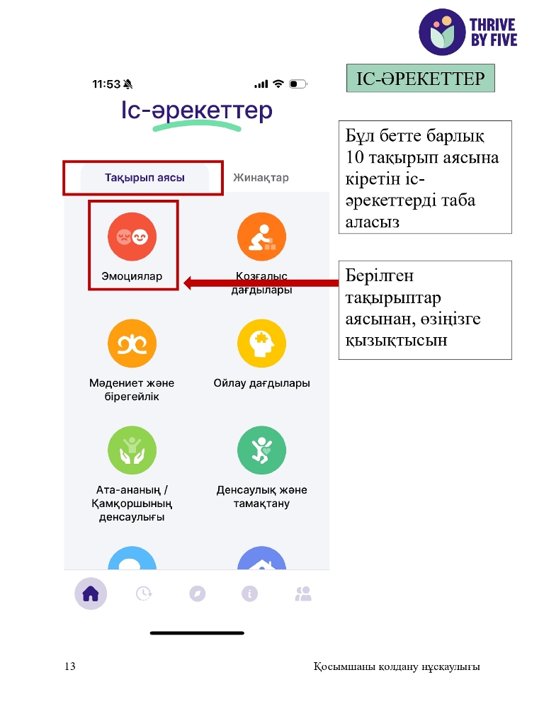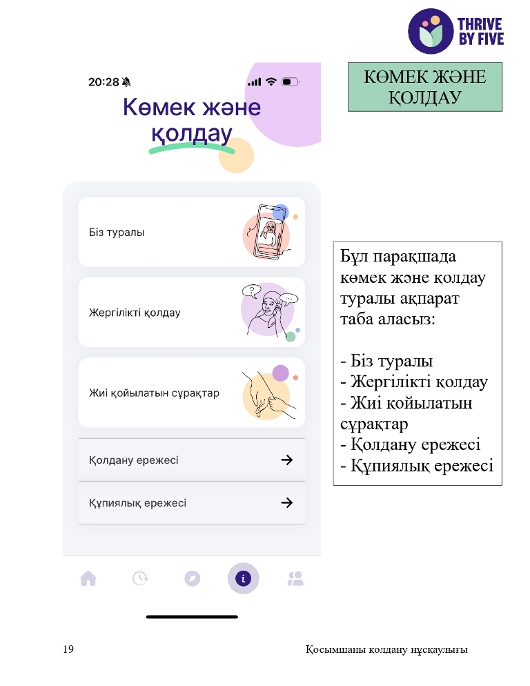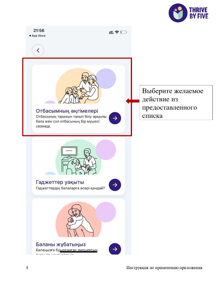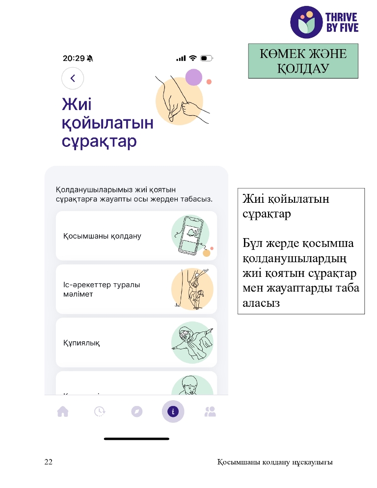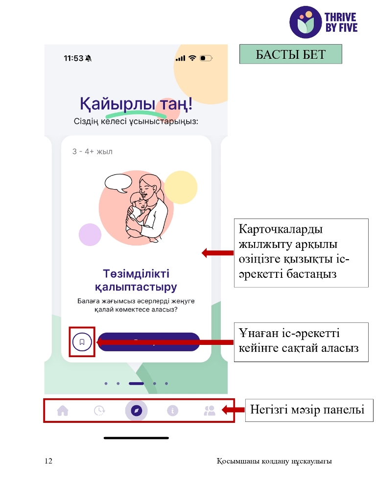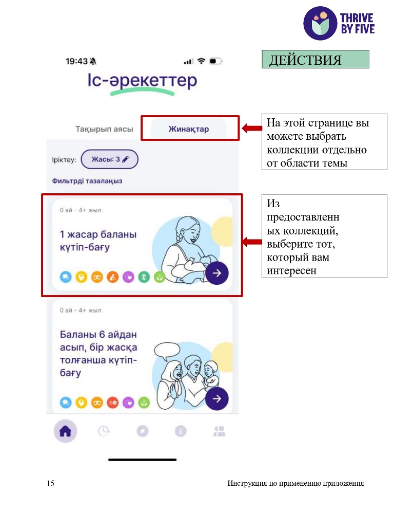 Мобильное приложение предоставляет для родителей, воспитывающих детей в домашних условиях, легкодоступные короткие практические активности по здоровью и питанию, воспитанию, развитию творческих и коммуникативных навыков, играм и взаимоотношениям. Контент предоставляет 120 идей для занятий с детьми по 10 направлениям на казахском, русском и английском языках.
