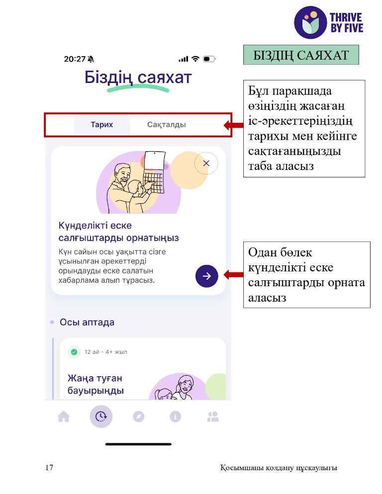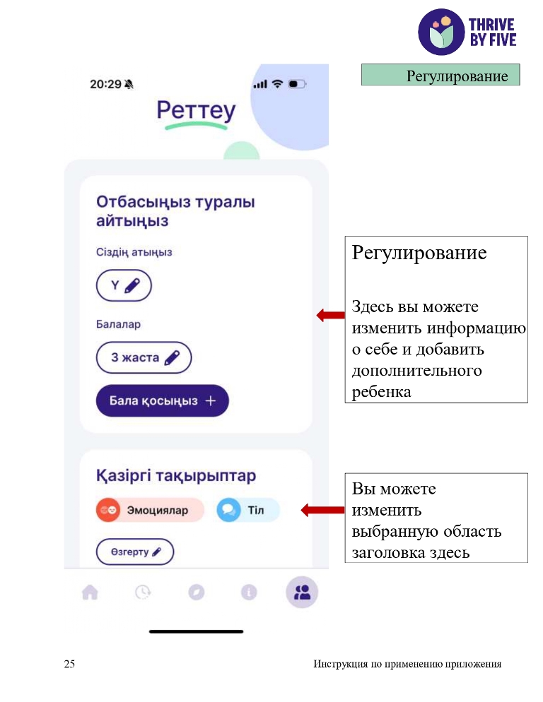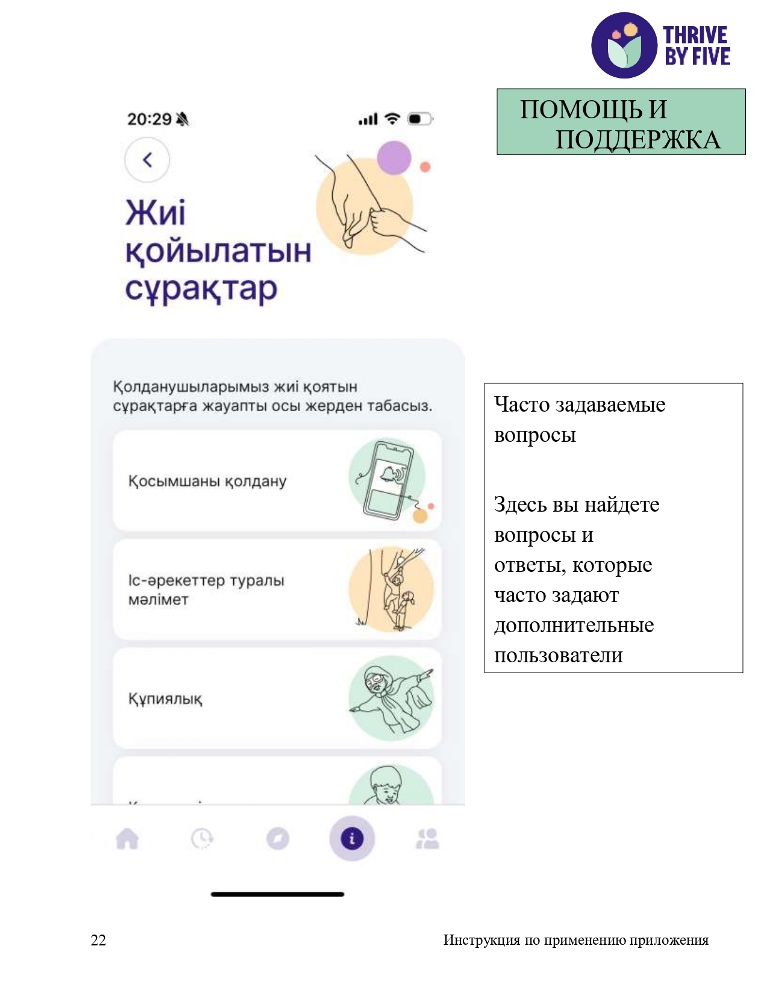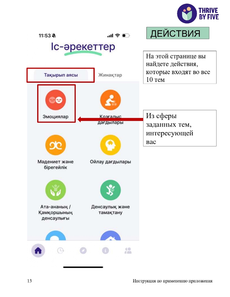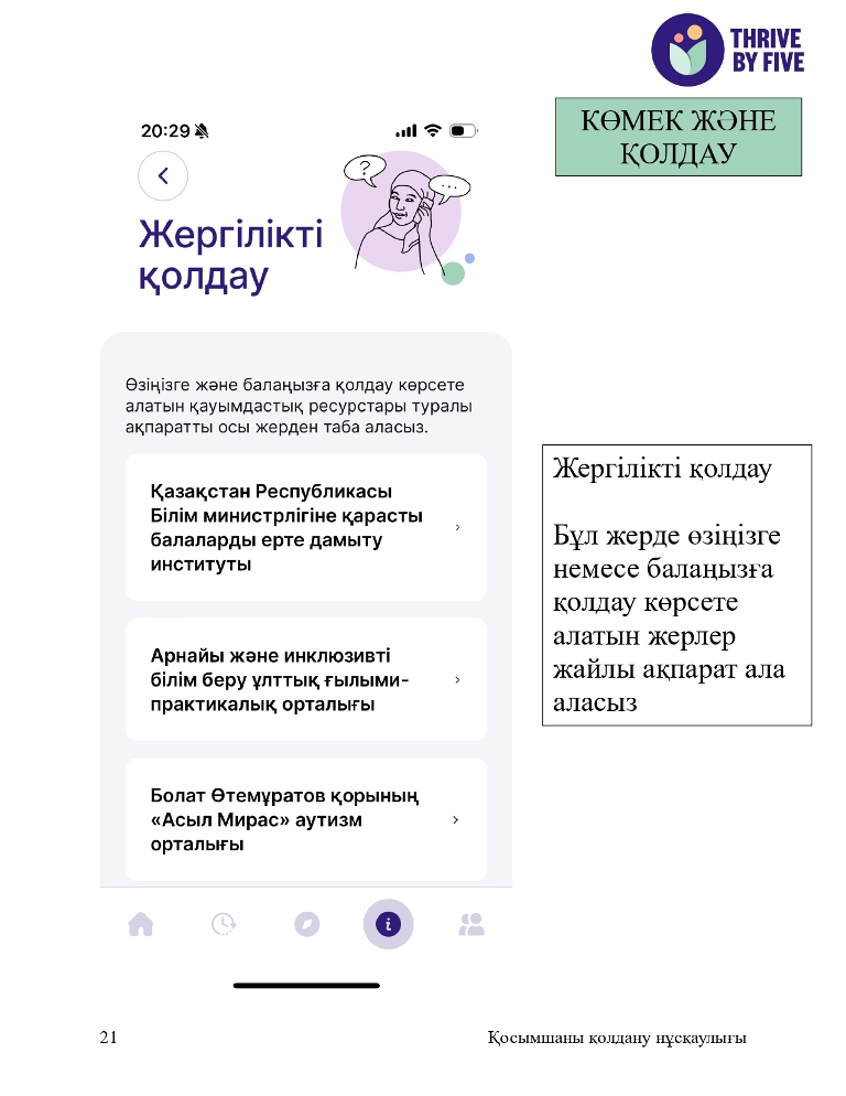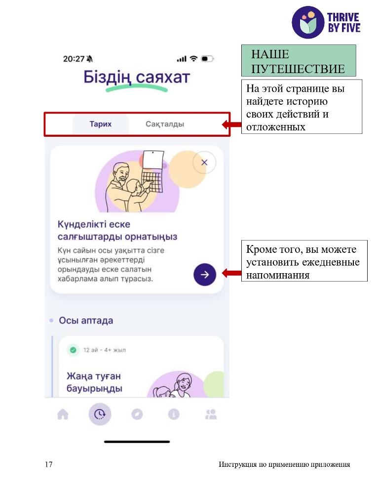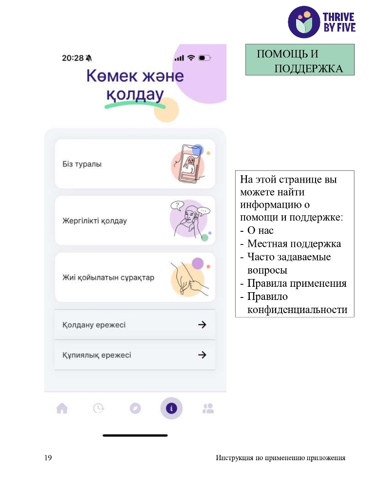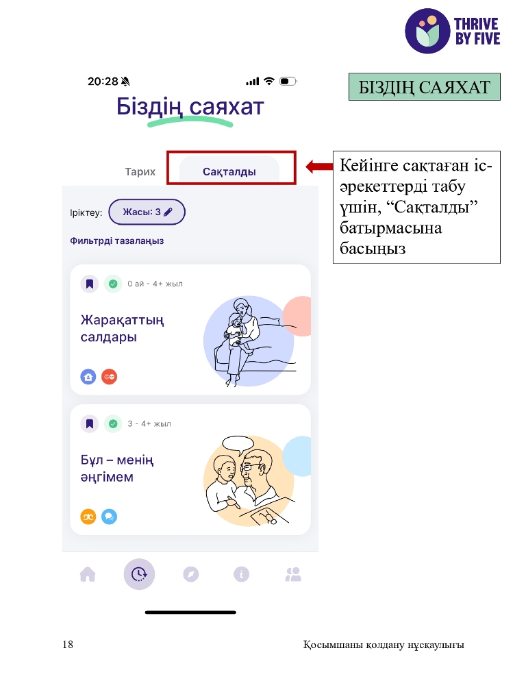 Мобильное приложение предоставляет для родителей, воспитывающих детей в домашних условиях, легкодоступные короткие практические активности по здоровью и питанию, воспитанию, развитию творческих и коммуникативных навыков, играм и взаимоотношениям. Контент предоставляет 120 идей для занятий с детьми по 10 направлениям на казахском, русском и английском языках.