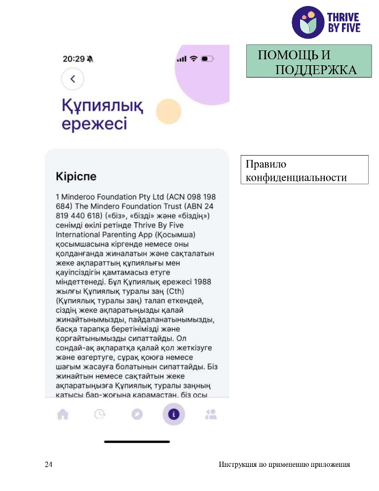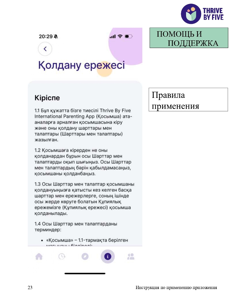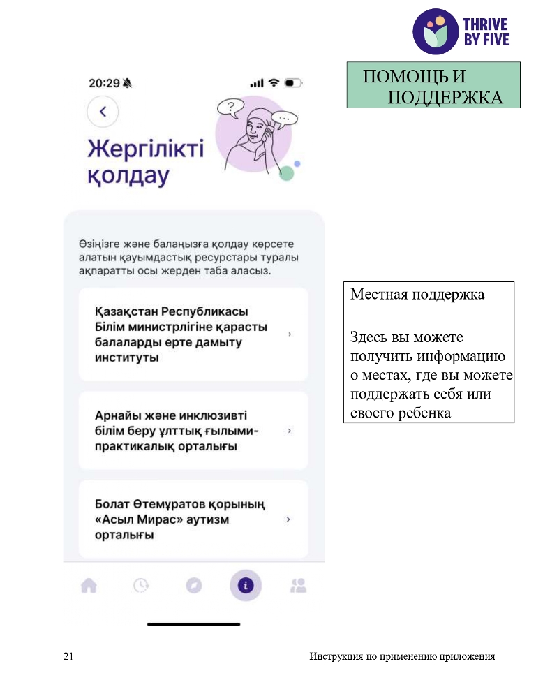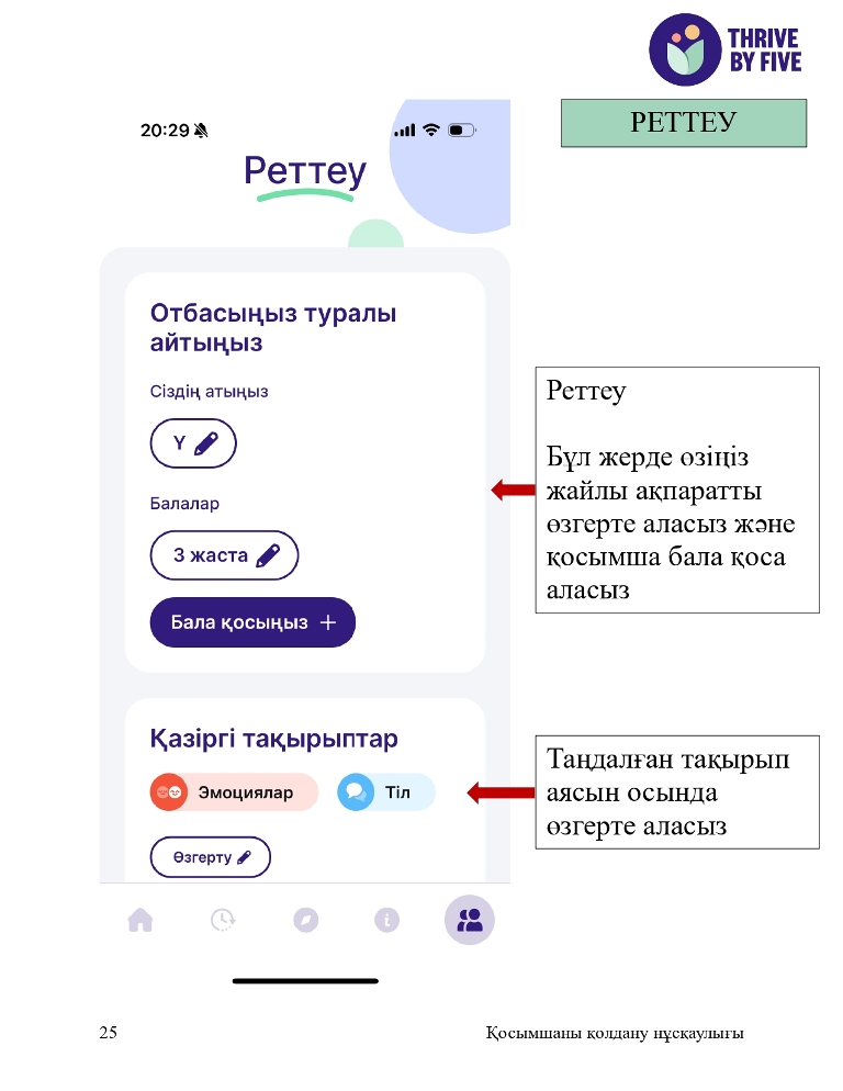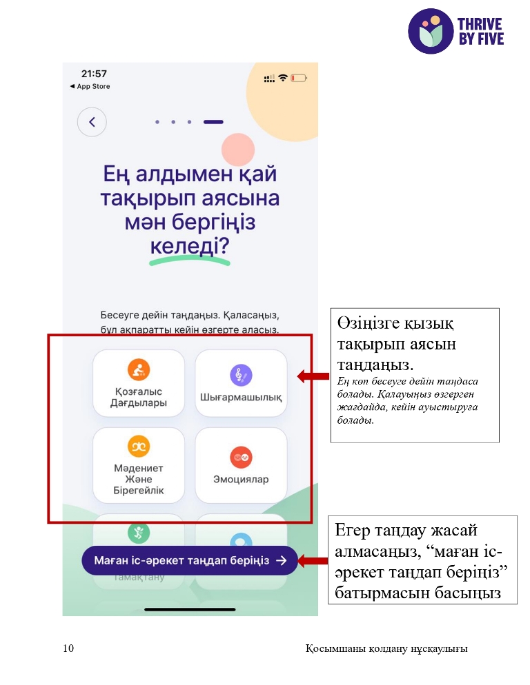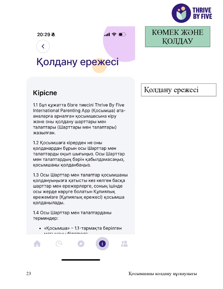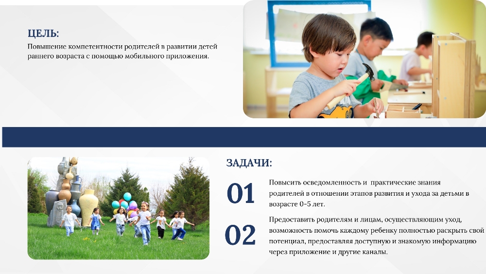 Мобильное приложение предоставляет для родителей, воспитывающих детей в домашних условиях, легкодоступные короткие практические активности по здоровью и питанию, воспитанию, развитию творческих и коммуникативных навыков, играм и взаимоотношениям. Контент предоставляет 120 идей для занятий с детьми по 10 направлениям на казахском, русском и английском языках.
