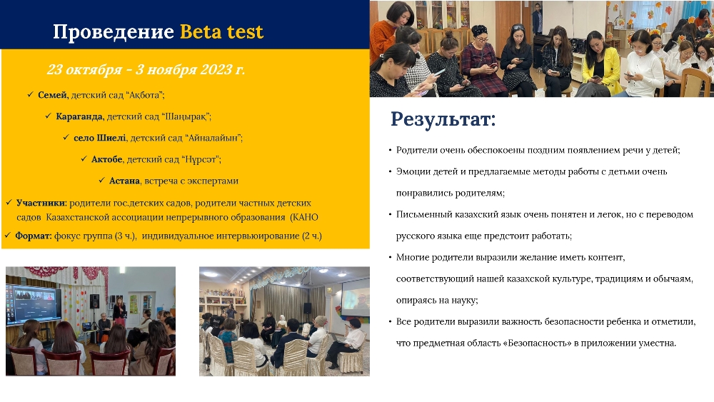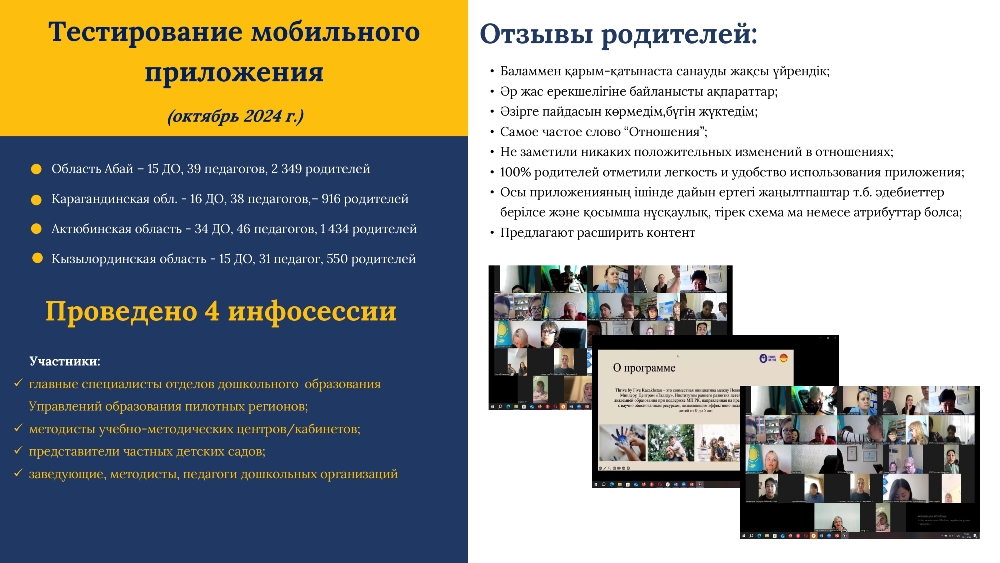 Приложение прошло апробацию в 4-х регионах (область Абай, Актюбинской, Карагандинской, Кызылординской областях), получило положительные отзывы родителей, педагогов и экспертов. В настоящее время мобильное приложение масштабируется по всей стране через консультационные пункты для родителей, дошкольные организации и другими доступными способами.